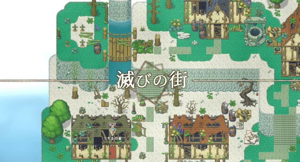 自分が何者なのかも分からず、記憶も常識もない状態のまま施設を彷徨い、外へ出る主人公。そこに広がっていたのは、空に島が浮かぶ謎の大陸でした。周囲には人の気配がなく、あるのは滅びた町だけ。そこで主人公は、眼帯をつけた少女リキルと出会います。