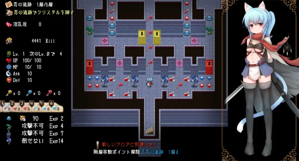 ゲーム部分は、WWA(World Wide Adventure)風のパズルRPG。ダンジョンでは鍵、アイテム、モンスターなどをうまく利用しながら攻略していきます。
