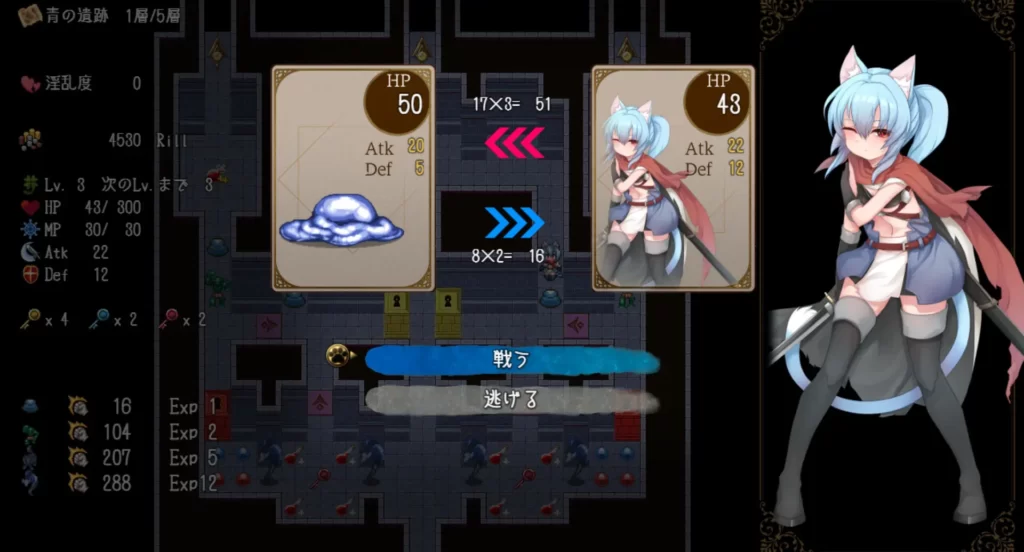 戦闘は非常にシンプルで、HP・攻撃力・防御力の計算によって瞬時に勝敗が決まる仕組み。そのためどの敵を倒すか、どの順番で進むか、鍵をどこで使うかといった戦略が重要になります。